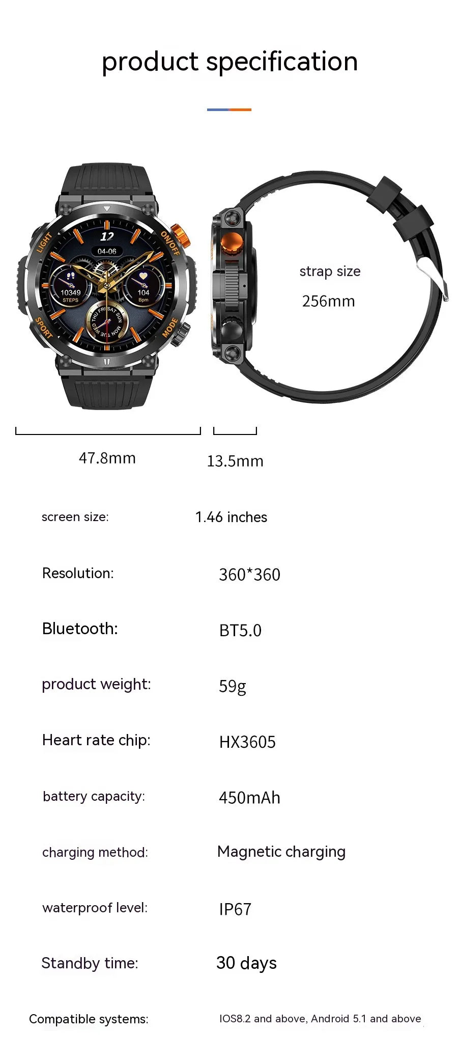 Experience the perfect blend of style, technology, and fitness with our Luxury Sport Smartwatch. Featuring a vibrant 1.85” full touch screen, it brings your apps, notifications, and fitness stats to life with crisp clarity and effortless navigation. Stay connected on the go with Bluetooth call functionality, allowing you to answer calls directly from your wrist, without reaching for your phone. Designed for active lifestyles, this smartwatch offers over 110 sports modes to track your workouts accurately, from running and cycling to yoga and swimming. Monitor your heart rate, blood pressure, and sleep patterns 24/7, helping you maintain optimal health and wellness. With two interchangeable straps, it effortlessly transitions from sporty to sophisticated, complementing any outfit or occasion. Compatible with both Android and iOS, this smartwatch is your all-in-one companion for productivity, fitness, and style. Elevate your everyday experience—smart, sleek, and designed to keep up with you.