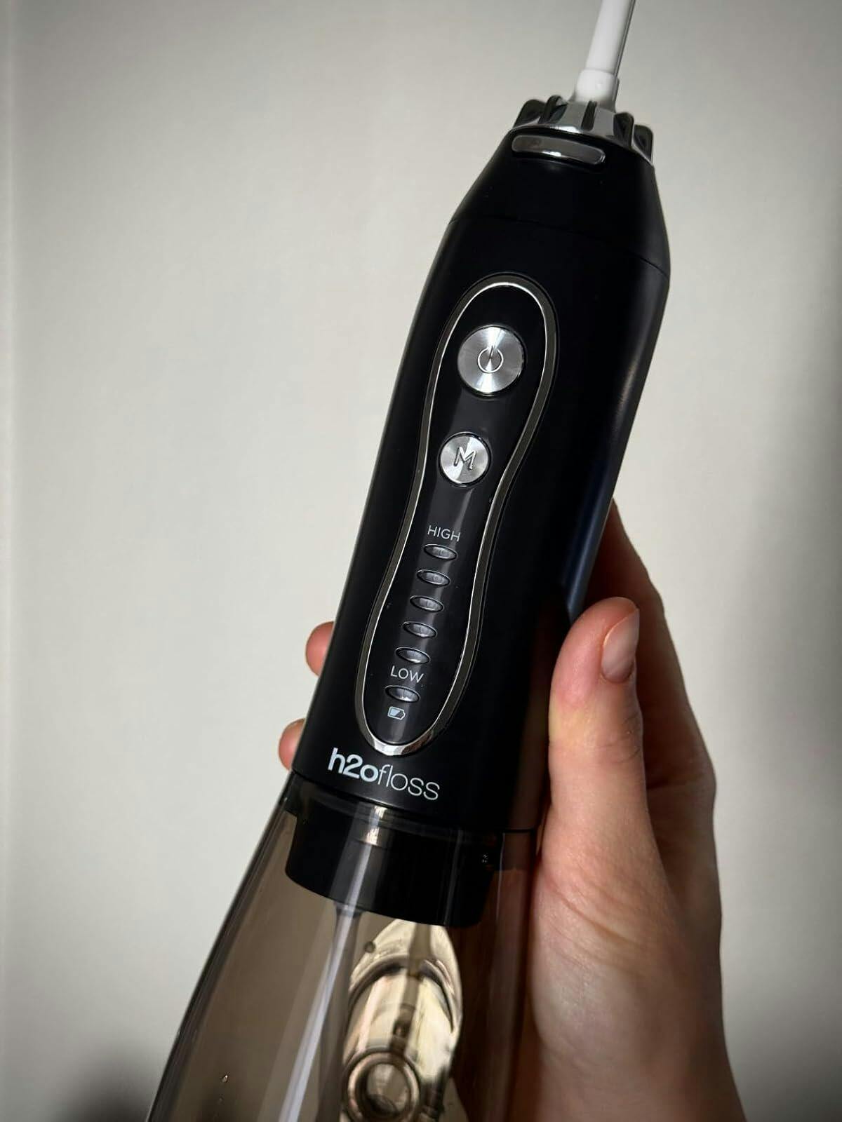 The H2ofloss features DIY pressure control, allowing you to adjust the water intensity to your comfort level — from gentle cleaning for sensitive gums to powerful deep cleaning.