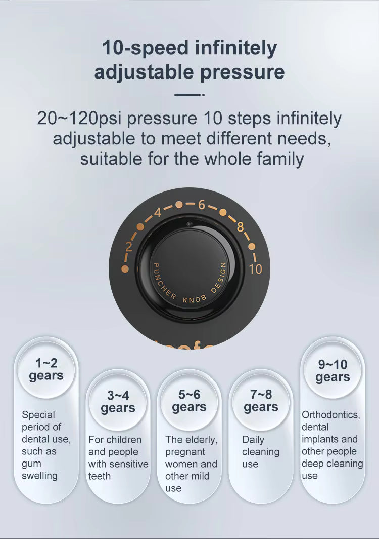 It features 10 adjustable pressure levels, allowing you to customize water pressure for gentle gum care or deep cleaning between teeth and around braces or implants.